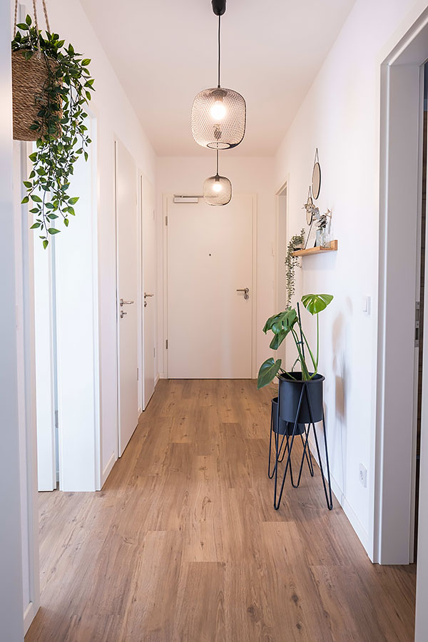Die großzügig geschnittene Dreizimmerwohnung liegt im Erdgeschoss und verfügt über eine Westterrasse und einen Gartenanteil. Die helle Wohnung (Fenster nach Osten, Süden und Westen) besteht aus einem offenen Wohnbereich mit Wohnzimmer und Küche, einem Schlafzimmer, einem Kinderzimmer, einem Abstellraum, Bad mit WC und Gäste-WC. Alle Räume sind mit Fußbodenheizung, die sich über Raumthermostate separat regulieren lässt, ausgestattet. Zur Wohnung gehört ein geräumiges Kellerabteil. Ebenfalls im Keller befindet sich ein Wasch- und ein Trockenraum. Alle Wohn- und Schlafräume sind mit hochwertigen und pflegeleichten Vinylböden (Eiche markant natur), die Sanitärräume mit Feinsteinfliesen von Saime Ceramiche ausgelegt.